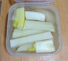 세 번째, 국물이 부족해지면 끓여 식힌 소금물을 추가하는 것도 동치미 맛있게 담는법에서 자주 사용하는 방법입니다.