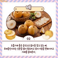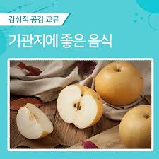 배는 예로부터 기침과 가래 완화에 좋은 과일로 알려져 있습니다. 수분 함량이 높고 기관지 점막을 촉촉하게 유지해 주어 기관지에 좋은 음식으로 가장 많이 언급됩니다. 배즙이나 배숙 형태로 섭취하면 효과를 더 잘 느낄 수 있습니다.